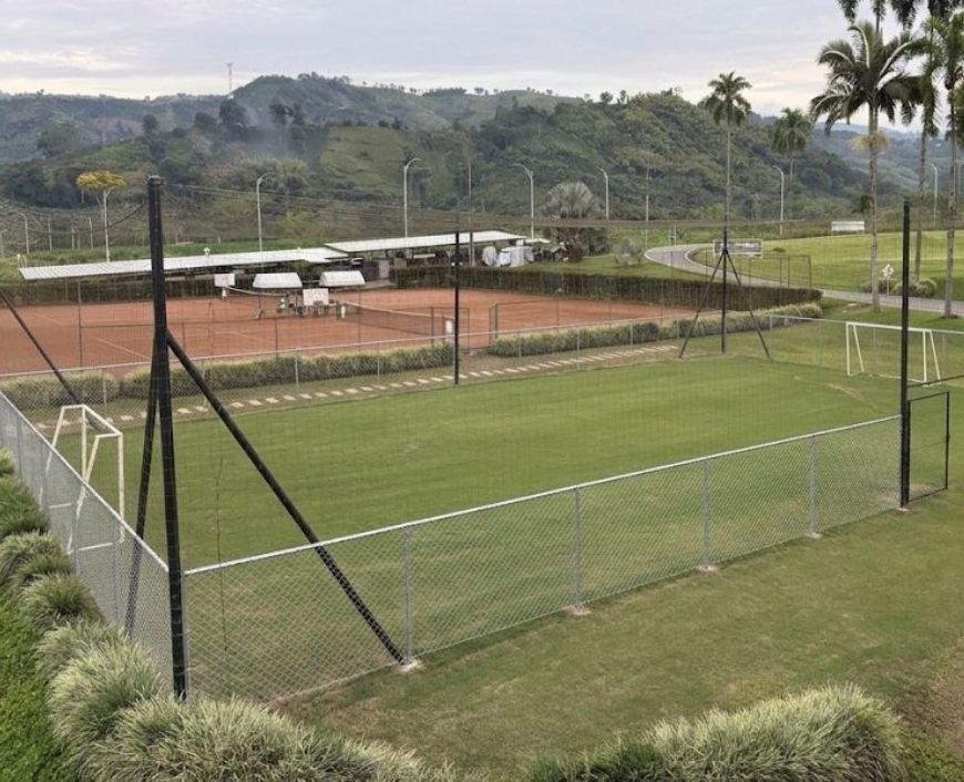 Cancha de fútbol 5 con césped natural y cerramiento perimetral en Sede Campestre, ideal para encuentros recreativos y competitivos en clima cálido.